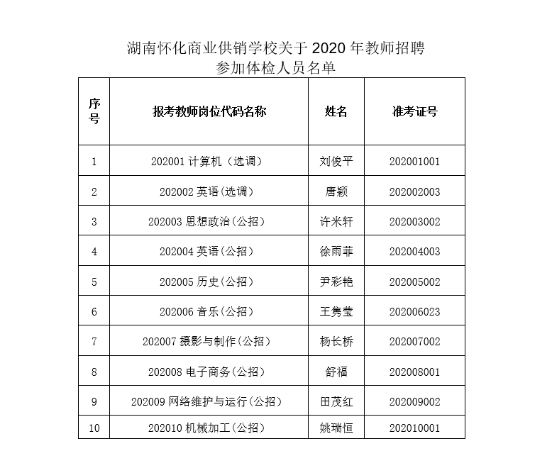 根據(jù)《湖南懷化商業(yè)供銷(xiāo)學(xué)校2020年教師招聘公告》(下簡(jiǎn)稱(chēng)《教師招聘公告》)有關(guān)規(guī)定,2020年湖南懷化商業(yè)供銷(xiāo)學(xué)校教師招聘筆試、說(shuō)課、面試工作已經(jīng)結(jié)束,考生考試成績(jī)分別于2020年12月6日、7日在湖南懷化商業(yè)供銷(xiāo)學(xué)校官網(wǎng)發(fā)布了公示,現(xiàn)就體檢有關(guān)事宜公告如下: