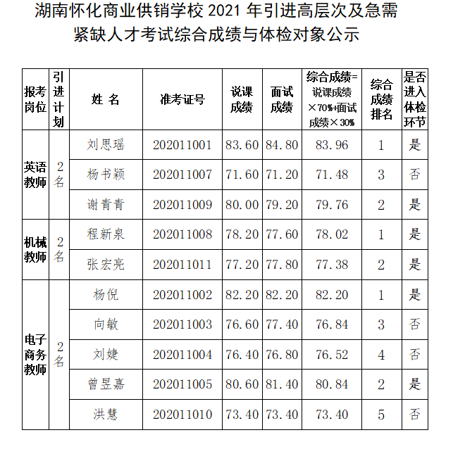 按照《懷化市2021年市直企事業(yè)單位引進(jìn)高層次及急需緊缺人才公告》有關(guān)規(guī)定,湖南懷化商業(yè)供銷(xiāo)學(xué)校2021年引進(jìn)高層次及急需緊缺人才考試工作已經(jīng)結(jié)束,現(xiàn)將考生的綜合成績(jī)公布如下。