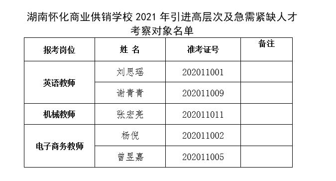 根據(jù)2020年11月23日中共懷化市委人才工作領(lǐng)導(dǎo)小組辦公室《懷化市2021年市直企事業(yè)單位引進(jìn)高層次及急需緊缺人才公告》的有關(guān)精神,經(jīng)報名、資格審查、考試和體檢,報考應(yīng)聘我校的5名同志(英語教師崗位謝青青、劉思瑤,機(jī)械工程教師崗位張宏亮,電子商務(wù)教師崗位楊倪、曾昱嘉)被確定為考察對象。為做本次引進(jìn)人才考察工作,特制定本方案。